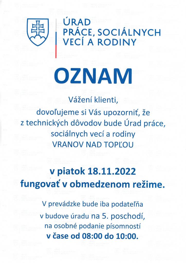 ÚRAD PRÁCE, SOCIÁLNYCH VECÍ A RODINY OZNAMUJE